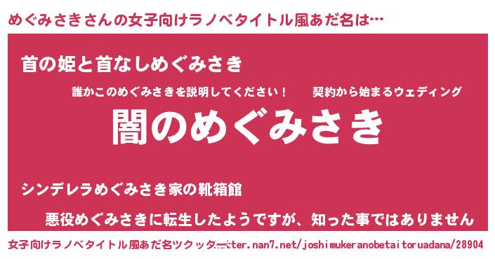| 男性向けラノベタイトル風あだ名 | 『Re:めぐみさきから始める異世界生活』 |
