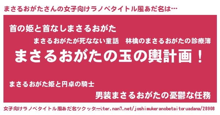 まさるおがたさんの女子向けラノベタイトル風あだ名は… 『まさるおがたの玉の輿計画!』『首の姫と首なしまさるおがた』『男装まさるおがたの憂鬱な任務』 ツクッター #女子向けラノベタイトル風あだ名ツクッター http://tkutter.nan7.net/joshimukeranobetaitoruadana/28908/