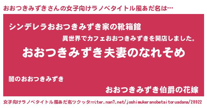 | 男性向けラノベタイトル風あだ名 | 『おまえをオタクにしてやるから、俺をおおつきみずきにしてくれ! 』 |