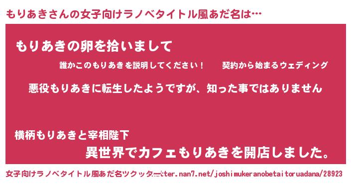 | 男性向けラノベタイトル風あだ名 | 『この素晴らしい世界にもりあきを!』 |