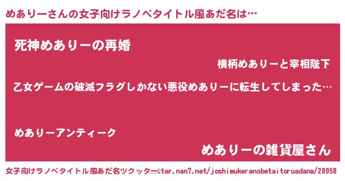 | 胡散臭い通販商品みたいなあだ名 | 『世界中を虜にした世界で10本だけ現存している希少なブランデー…その名も「めありー」』 |