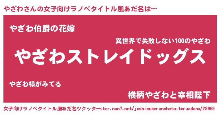 | 男性向けラノベタイトル風あだ名 | 『Re:やざわから始める異世界生活』 |