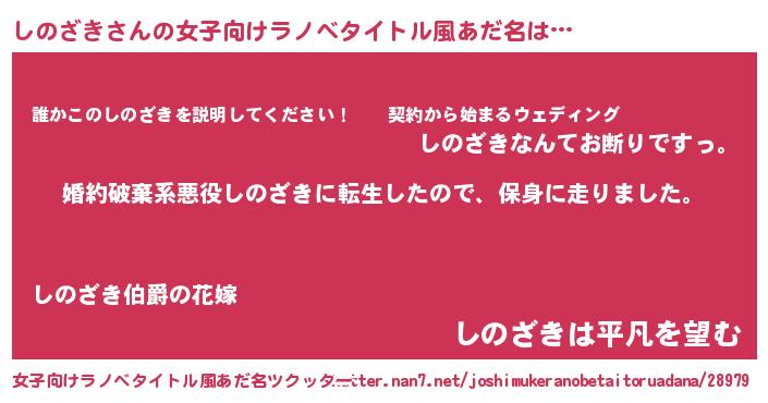 しのざきさんの女子向けラノベタイトル風あだ名は… 『婚約破棄系悪役しのざきに転生したので、保身に走りました。』『誰かこのしのざきを説明してください! ~契約から始まるウェディング~』『しのざきは平凡を望む』 ツクッター #女子向けラノベタイトル風あだ名ツクッター http://tkutter.nan7.net/joshimukeranobetaitoruadana/28979/
