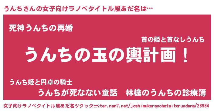 | 男性向けラノベタイトル風あだ名 | 『うんち~年齢イコール彼女いない歴の魔法使い~』 |