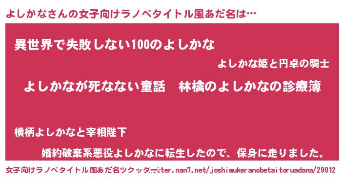 | 男性向けラノベタイトル風あだ名 | 『魔弾の王とよしかな』『よしかなの憂鬱』 |