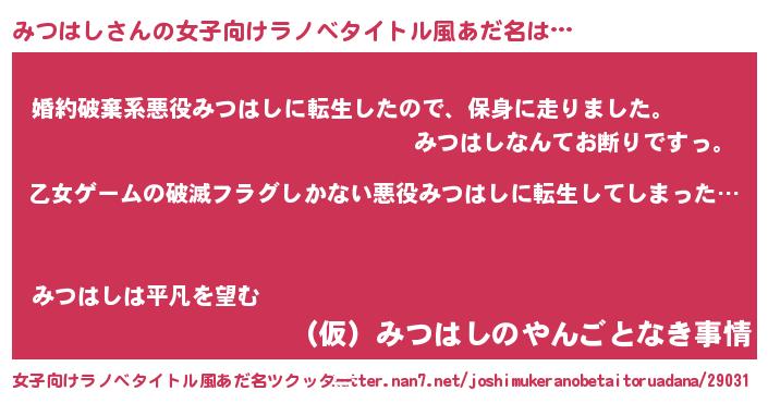 | 男性向けラノベタイトル風あだ名 | 『この素晴らしい世界にみつはしを!』 |