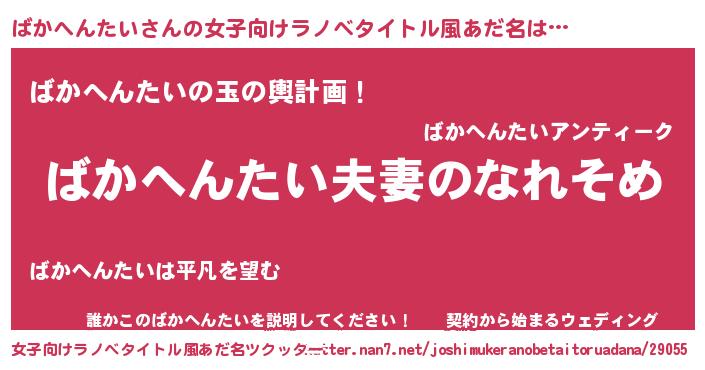 | 男性向けラノベタイトル風あだ名 | 『おまえをオタクにしてやるから、俺をばかへんたいにしてくれ! 』 |