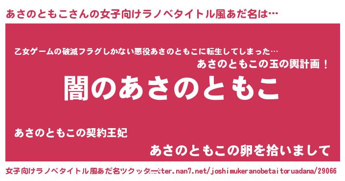 | 男性向けラノベタイトル風あだ名 | 『Re:あさのともこから始める異世界生活』 |