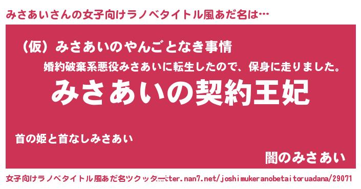 | 男性向けラノベタイトル風あだ名 | 『みさあいという概念が存在しない退屈な世界 』 |