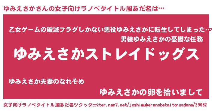 | 男性向けラノベタイトル風あだ名 | 『Re:ゆみえさかから始める異世界生活』 |