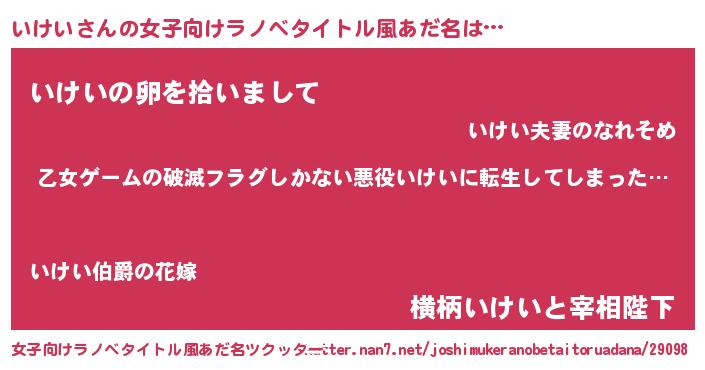 | 男性向けラノベタイトル風あだ名 | 『この素晴らしい世界にいけいを!』 |