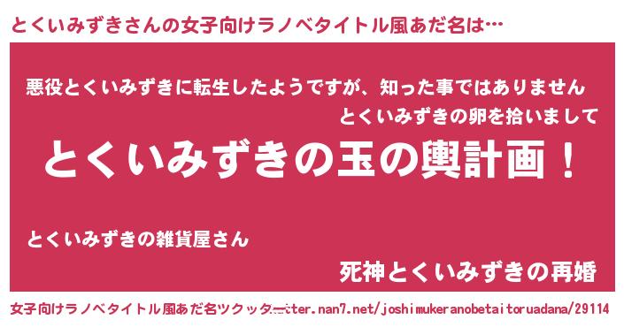男性向けラノベタイトル風あだ名 | 『とくいみずき~年齢イコール彼女いない歴の魔法使い~』 |