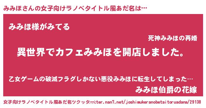 | 男性向けラノベタイトル風あだ名 | 『誰もが恐れるあのみみほが、ぼくの専属メイドになるようです。』 |