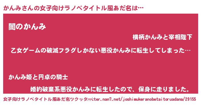 | 男性向けラノベタイトル風あだ名 | 『この素晴らしい世界にかんみを!』 |