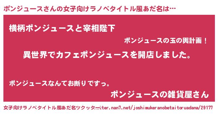 | 男性向けラノベタイトル風あだ名 | 『誰もが恐れるあのポンジュースが、ぼくの専属メイドになるようです。』 |
