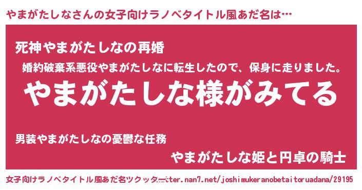 | 男性向けラノベタイトル風あだ名 | 『やまがたしなの嫁は女の子じゃないと思った?』 |
