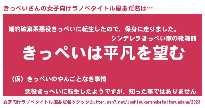 きっぺいさんの女子向けラノベタイトル風あだ名は… 『きっぺいは平凡を望む』『婚約破棄系悪役きっぺいに転生したので、保身に走りました。』『悪役きっぺいに転生したようですが、知った事ではありません』 ツクッター #女子向けラノベタイトル風あだ名ツクッター http://tkutter.nan7.net/joshimukeranobetaitoruadana/2923/