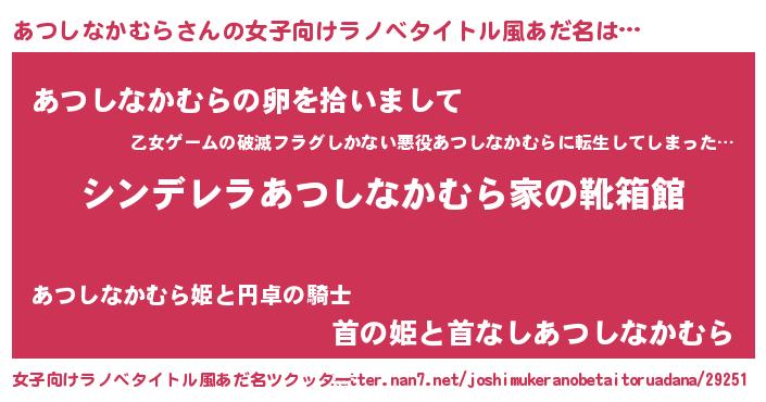 | 男性向けラノベタイトル風あだ名 | 『冴えないあつしなかむらの育てかた』 |