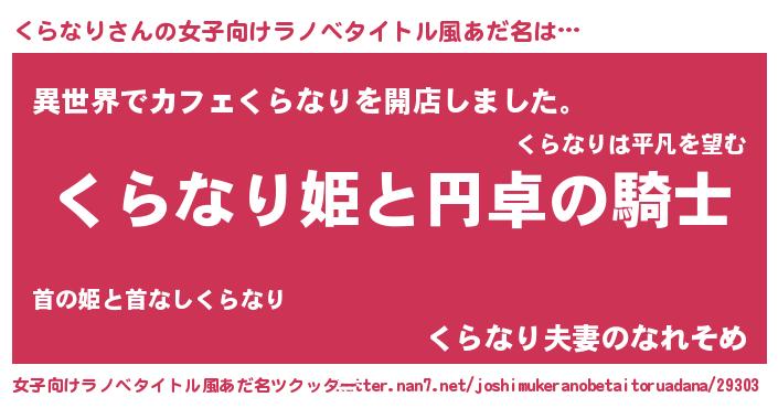 くらなりさんの女子向けラノベタイトル風あだ名は… 『くらなり姫と円卓の騎士』『異世界でカフェくらなりを開店しました。』『くらなり夫妻のなれそめ』 ツクッター #女子向けラノベタイトル風あだ名ツクッター http://tkutter.nan7.net/joshimukeranobetaitoruadana/29303/