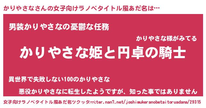 かりやさなさんの女子向けラノベタイトル風あだ名は… 『かりやさな姫と円卓の騎士』『男装かりやさなの憂鬱な任務』『悪役かりやさなに転生したようですが、知った事ではありません』 ツクッター #女子向けラノベタイトル風あだ名ツクッター http://tkutter.nan7.net/joshimukeranobetaitoruadana/29315/