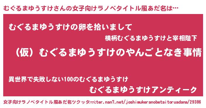| 男性向けラノベタイトル風あだ名 | 『むぐるまゆうすけの憂鬱』 |