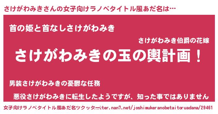 | 男性向けラノベタイトル風あだ名 | 『さけがわみき~年齢イコール彼女いない歴の魔法使い~』 |