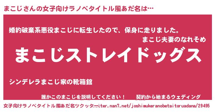 まこじさんの女子向けラノベタイトル風あだ名は… 『まこじストレイドッグス』『婚約破棄系悪役まこじに転生したので、保身に走りました。』『誰かこのまこじを説明してください! ~契約から始まるウェディング~』 ツクッター #女子向けラノベタイトル風あだ名ツクッター http://tkutter.nan7.net/joshimukeranobetaitoruadana/29495/