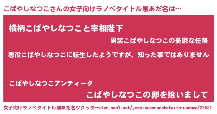 | 男性向けラノベタイトル風あだ名 | 『この素晴らしい世界にこばやしなつこを!』 |