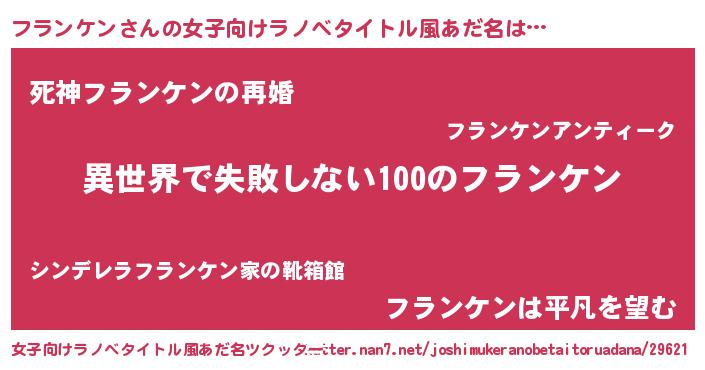 | 胡散臭い通販商品みたいなあだ名 | 『絶対に幸福をもたらす水素水…その名も「フランケン」』 |