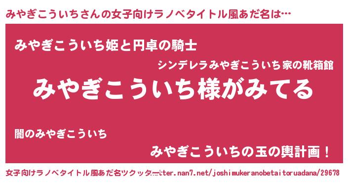 | 男性向けラノベタイトル風あだ名 | 『みやぎこういちの嫁は女の子じゃないと思った?』 |