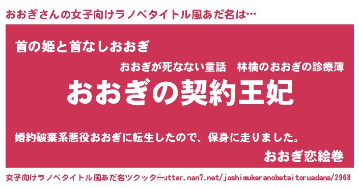 | 胡散臭い通販商品みたいなあだ名 | 『来世でも幸せになれる水素水…その名も「おおぎ」』 |