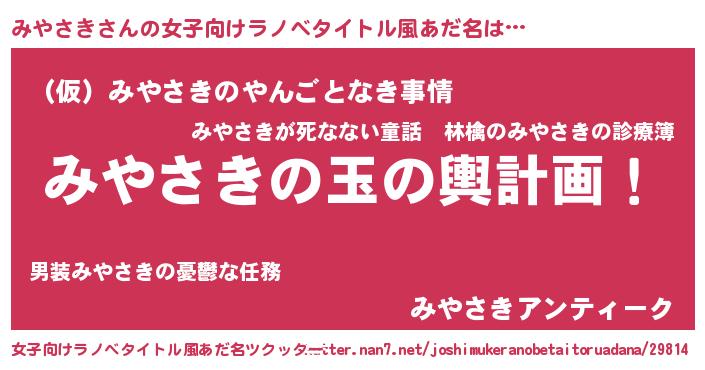 | 男性向けラノベタイトル風あだ名 | 『みやさき~年齢イコール彼女いない歴の魔法使い~』 |