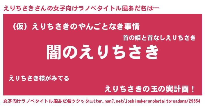 えりちさきさんの女子向けラノベタイトル風あだ名は… 『闇のえりちさき』『(仮)えりちさきのやんごとなき事情』『えりちさきの玉の輿計画!』 ツクッター #女子向けラノベタイトル風あだ名ツクッター http://tkutter.nan7.net/joshimukeranobetaitoruadana/29854/
