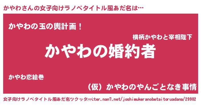 かやわさんの女子向けラノベタイトル風あだ名は… 『かやわの婚約者』『かやわの玉の輿計画!』『(仮)かやわのやんごとなき事情』 ツクッター #女子向けラノベタイトル風あだ名ツクッター http://tkutter.nan7.net/joshimukeranobetaitoruadana/29902/