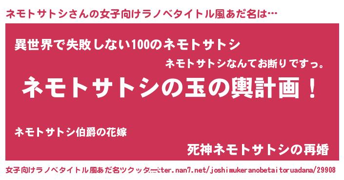 | 男性向けラノベタイトル風あだ名 | 『ネモトサトシ~年齢イコール彼女いない歴の魔法使い~』 |