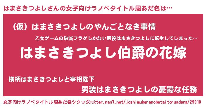 | 男性向けラノベタイトル風あだ名 | 『うちの娘の為ならば、俺はもしかしたらはまさきつよしも倒せるかもしれない。』 |