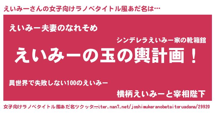 | 男性向けラノベタイトル風あだ名 | 『えいみー~年齢イコール彼女いない歴の魔法使い~』 |