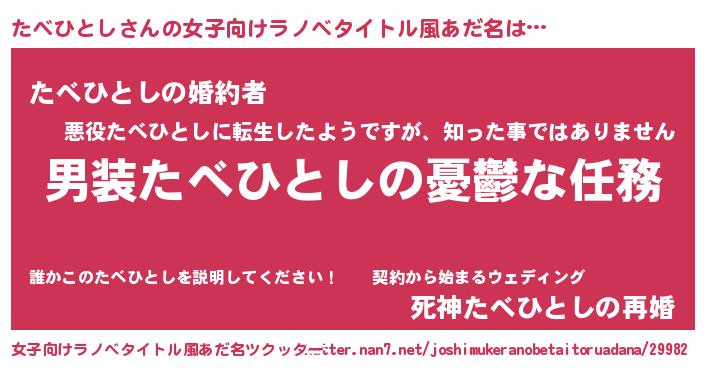 | 男性向けラノベタイトル風あだ名 | 『うちのたべひとしが世界を掌握している!』 |