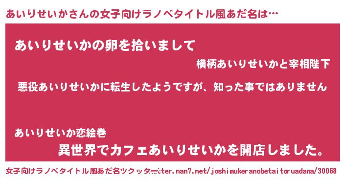 | 男性向けラノベタイトル風あだ名 | 『この素晴らしい世界にあいりせいかを!』 |