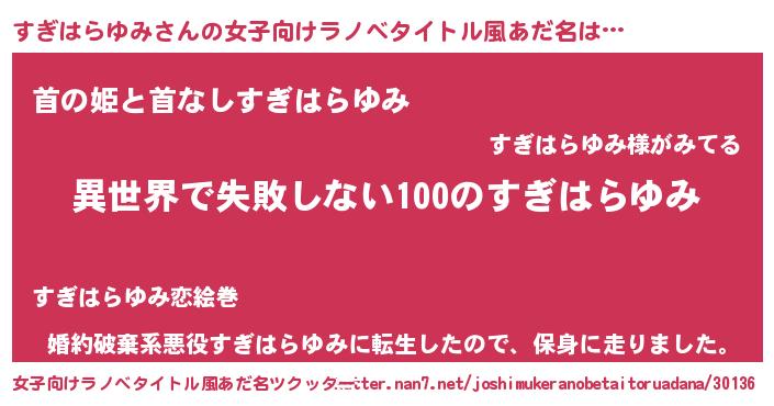 | 胡散臭い通販商品みたいなあだ名 | 『絶対に幸福をもたらす健康食品…その名も「すぎはらゆみ」』 |