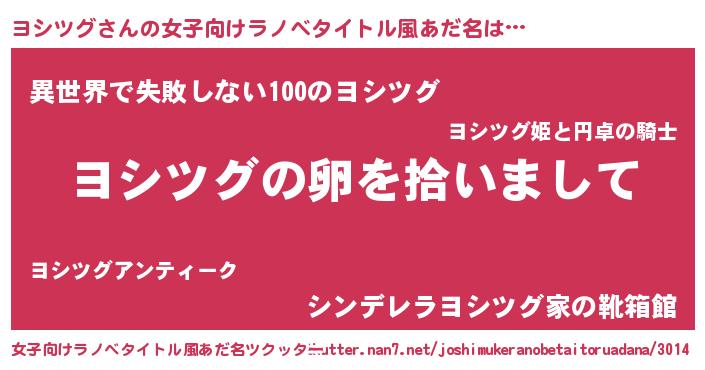 | 男性向けラノベタイトル風あだ名 | 『ヨシツグの嫁は女の子じゃないと思った?』 |