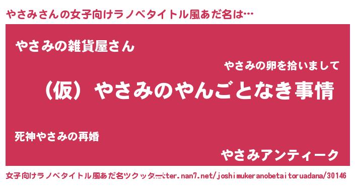 | 男性向けラノベタイトル風あだ名 | 『やさみの憂鬱』『魔法科高校のやさみ』 |