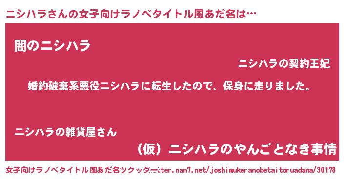 | 男性向けラノベタイトル風あだ名 | 『ニシハラスレイヤー』『ニシハラの憂鬱』 |