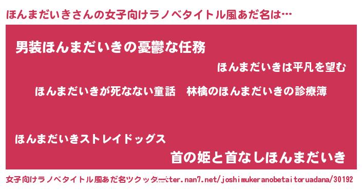 | 男性向けラノベタイトル風あだ名 | 『魔弾の王とほんまだいき』 |