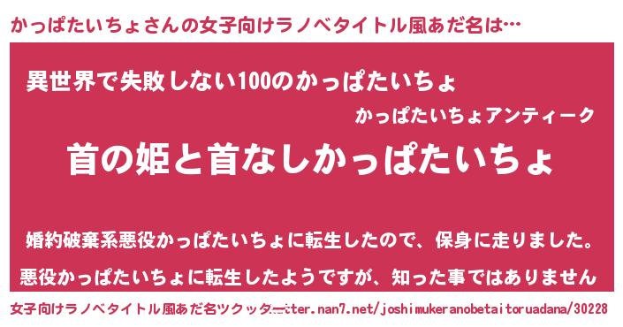 | 男性向けラノベタイトル風あだ名 | 『はたらくかっぱたいちょさま!』 |