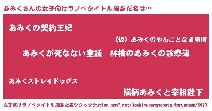| 男性向けラノベタイトル風あだ名 | 『魔弾の王とあみく』『あみくの憂鬱』 |