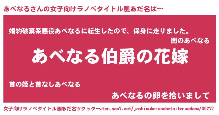 | 男性向けラノベタイトル風あだ名 | 『うちの娘の為ならば、俺はもしかしたらあべなるも倒せるかもしれない。』 |