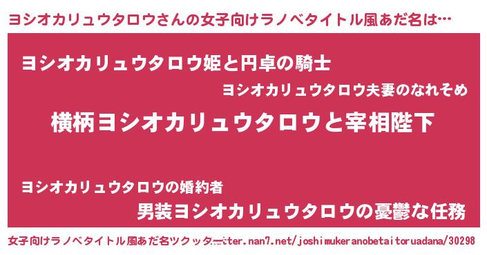 | 男性向けラノベタイトル風あだ名 | 『ヨシオカリュウタロウに滅ぼされるだけの簡単なお仕事です』 |