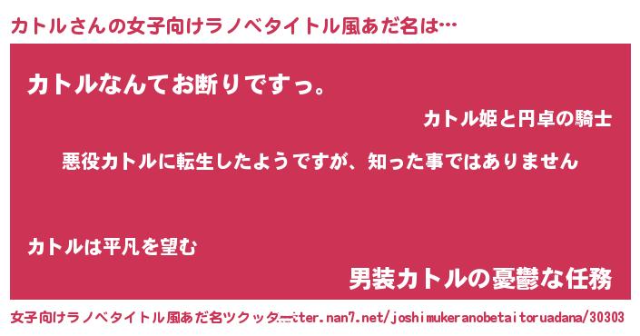 | 男性向けラノベタイトル風あだ名 | 『この素晴らしい世界にカトルを!』 |