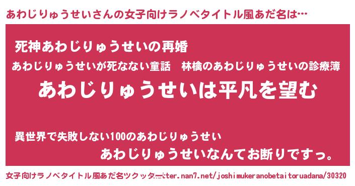 | 男性向けラノベタイトル風あだ名 | 『ダンジョンにあわじりゅうせいを求めるのは間違っているだろうか』 |
